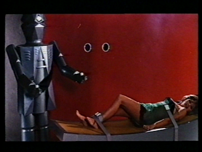 Argoman’s clearly had enough of her and her hats, so he naturally refuses when she makes the inevitable offer for him to join her as her consort. Prepared for this rejection, Jenabelle reveals that she’s captured his other girlfriend, Samantha. (The one he called and got tired of waiting for.) She reveals a video screen showing Samantha being tormented by a monstrous robot. It’s not quite clear what the metal brute is doing to her, but Jenabelle assures us that "it’s not a pleasant fate to suffer at the hands of a robot." Best of all, she pronounces it "RO-but," like Dr. Zoidberg on Futurama.