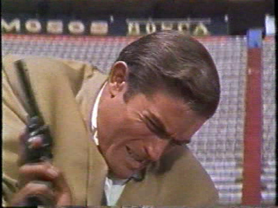 The driver pulls into a bullring and drives the car into the dead center of the arena. He realizes that Tarzan’s onto him and he pulls a gun, but Tarzan’s too fast for him and punches the guy. Then a sniper shoots him for good measure, presumably so he won’t reveal anything to Tarzan. It’s all very reminiscent of James Bond’s ride from the airport in Dr. No. (Surely a coincidence?) Then, unfortunately, the sniper starts taking shots at Tarzan, who’s a sitting duck in the middle of the arena, surrounded by empty grandstands. Tarzan takes cover behind the car, and Mike Henry deserves a lot of credit for moving like Tarzan here, in a very animal-like fashion. He may be dressed like a spy, but the actor manages to remind us we’re watching Tarzan through his movements.