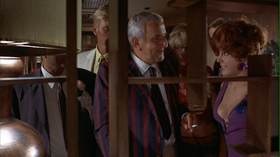 All of Diabolik’s heists and crimes are perpetrated against authority. He’s liberal with his use of knives and bullets, but only against police, security guards, mob kingpins and other authority figures. And the movie does nothing to endear audiences to those authority figures, either. With the noted exception of Ginko (portrayed in the Guissani Sisters’ original comic books as Diabolik’s doppelganger), not one of them has an ounce of sense. Terry-Thomas is the Minister of the Interior for crying out loud! It’s certainly no accident that Bava cast someone known only for playing twits. The police officers guarding the initial cash shipment that Diabolik knocks off are equally idiotic. The slovenly, slouching cops fail miserably in their attempts to pass themselves off as upper-crust society types, out for a pleasant drive in the Rolls. And the helicopter that hovers overhead keeping tabs on the situation (what authority is higher than an eye in the sky?) identifies itself on the radio as "Aerial Surveillance Ship #1." Weird call sign? Go ahead, note the acronym. From the very first scene, we’re alerted that in this film, all representatives of the establishment are unmitigated asses!