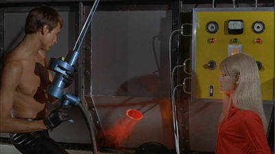 The characters aren’t the only ones with sex on the brain. Bava crams more sexual imagery into this movie than an entire Hitchcock film festival! From the stalactites in the cave leading to Diabolik’s underground lair to the vertical pipes in the organ that serves as its alarm to the gearshift in his Jaguar that Eva excitedly shifts for him when she’s turned on as he races down a winding road, there are phallic symbols everywhere. And after stealing the gold ingot, Diabolik sets about melting it down. Eva looks on eagerly as he wields a large hose between his legs, preparing to issue molten gold from it into a mold. We see him and his hose framed between her statuesque legs, just in case we still don’t get it. Then we see her bite her lower lip as the gold spurts out. It’s ridiculously over the top, but so appropriate for this movie! And really rather shocking for 1967. In poking fun at the sexuality in James Bond films with scenes like this, Danger: Diabolik actually manages to one-up 007 on that count.